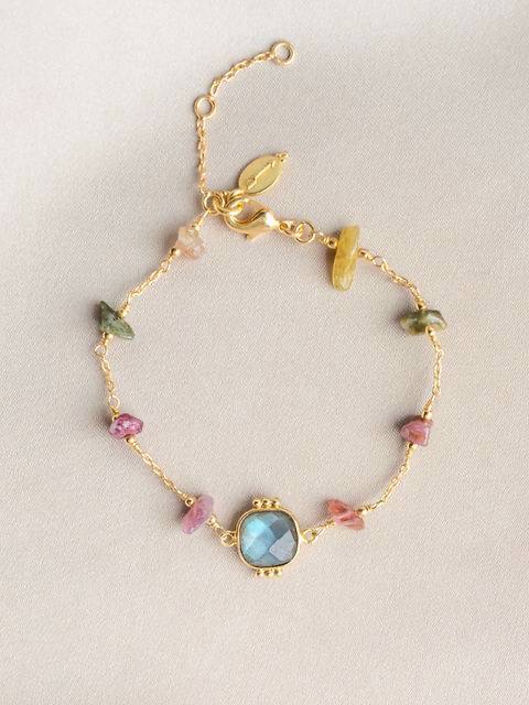 手鍊由碧璽碎石和拉長石吊墜組成,並鍍有優質黃金。